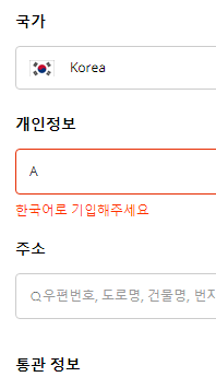 먼저 주소필드를 한글 주소로 업데이트 하는데, 우편번호와 번지단위까지의 기본 주소는 국내 사이트처럼 주소검색으로 입력이 되었고, 팝업창으로 별도로 구분하지 않고 수정페이지에서 주소 검색과 입력이 되어서 편리했다.