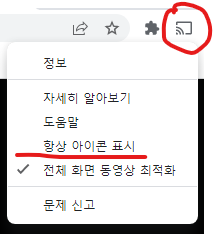 4. 음악 전송이 시작되면 탭과 툴바에 전송 아이콘과 버튼이 추가되면서 구글 홈 미니로 음악이 재생됩니다. -전송 버튼을 툴바에 고정하려면 툴바에 표시된 전송 버튼을 우클릭 후 메뉴에서 '항상 아이콘 표시'를 선택하면 됩니다.